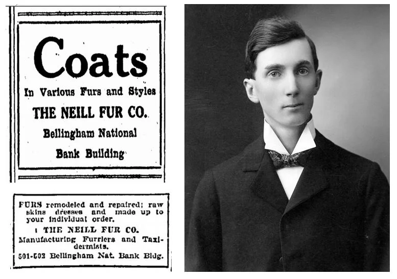 Neill Fur Ads from the Bellingham Herald, circa 1920. Photo of Walter Neill courtesy Gary Gordon.