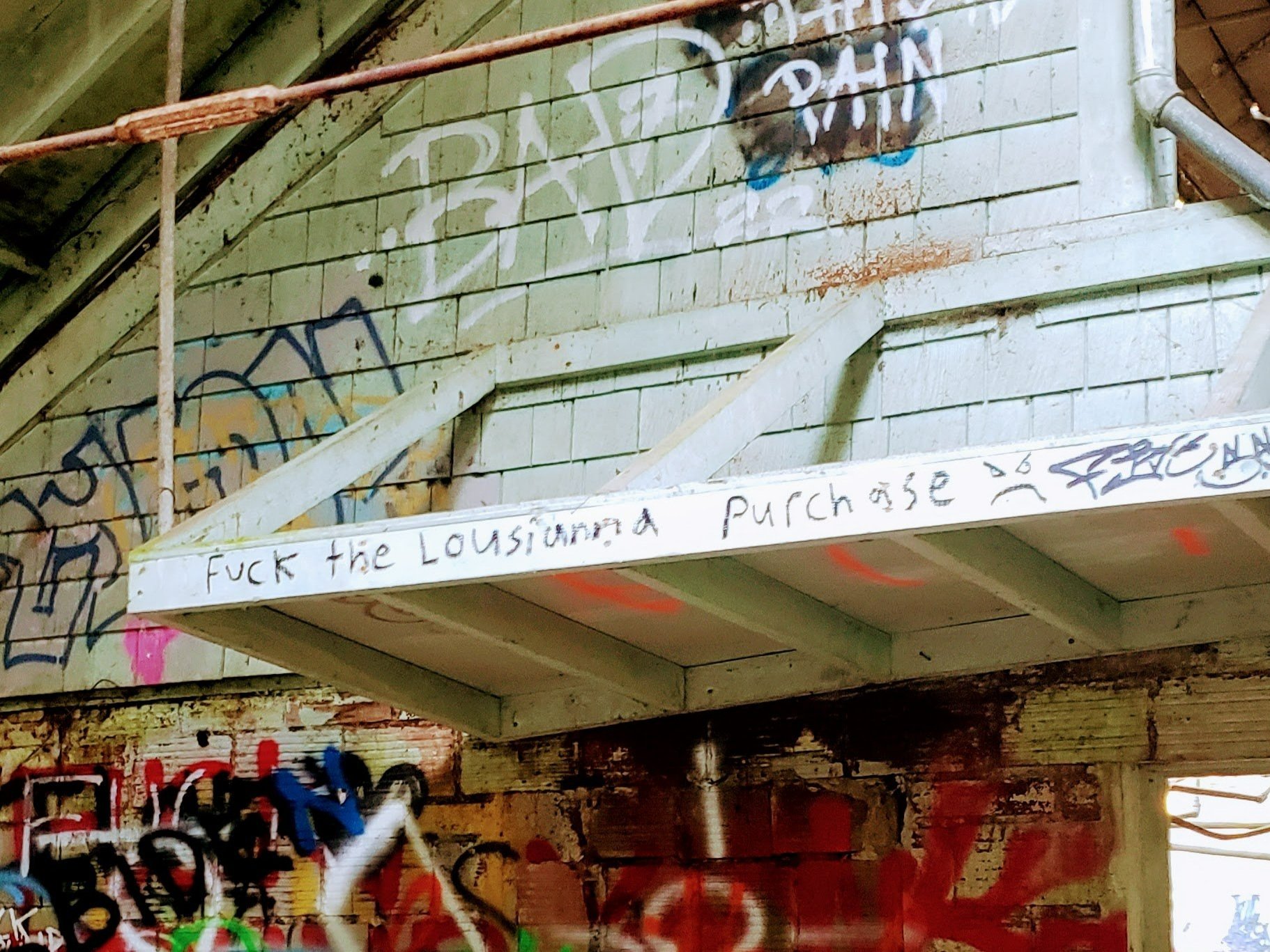 Graffiti on old structure at Northern State Asylum Recreation Area in Sedro Woolley, Washington